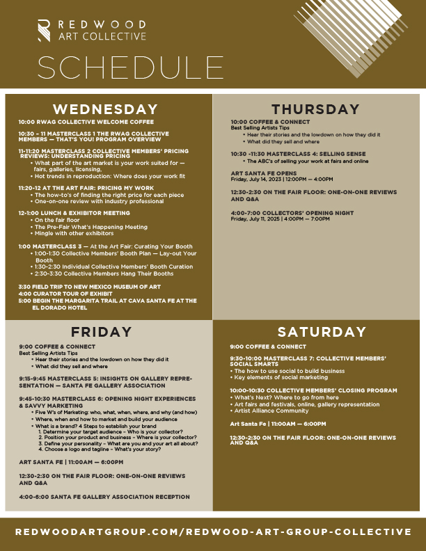 Before, during, and after Art Santa Fe 2026, the Redwood Art Group Collective will be held July 8 through July 11, 2026.
